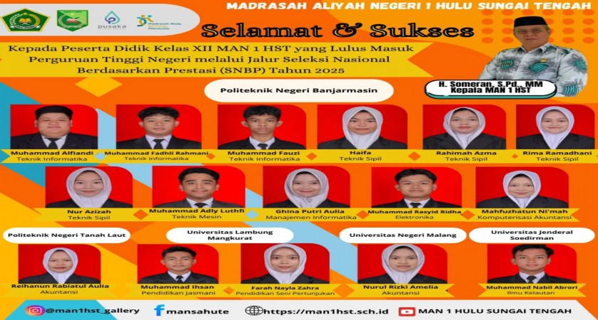 Barabai (MAN 1 HST )– Sebanyak 16 peserta didik dari Madrasah Aliyah Negeri (MAN) 1 Hulu Sungai Tengah (HST) berhasil lolos Seleksi Nasional Berdasarkan Prestasi (SNBP) 2025 dan diterima di berbagai perguruan tinggi negeri (PTN) terkemuka di Indonesia.