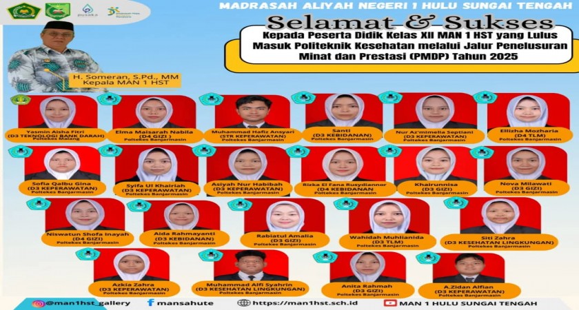 Barabai (MAN 1 HST) – Sebanyak 21 peserta didik dari Madrasah Aliyah Negeri (MAN) 1 Hulu Sungai Tengah (HST) berhasil lolos seleksi masuk Politeknik Kesehatan (Poltekkes) melalui jalur Penelusuran Minat dan Prestasi (PMDP) tahun 2025. Prestasi membanggakan ini menjadi bukti kualitas pendidikan di MAN 1 HST dalam mencetak siswa berprestasi di bidang akademik maupun non-akademik.