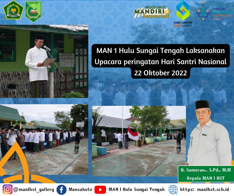 Perayaan Hari Santri Nasional 22 Oktober 2022 di MAN 1 Hulu Sungai Tengah berlangsung dengan sakral dan khidmat dalam setiap butir-butir susunan acaranya, Pembina Upacara Muhammad As'adi berharap "semoga dengan diadakannya apel peringatan hari santri ini, para peserta didik bisa mengambil hikmah kenapa sampai ada hari santri nasional yang diperingati setiap tahunnya, kemudian kita sebagai santri atau sebagai pelajar indonesia menghormati dan menghargai perjuangan mereka semua (moment perjuangan para kyai dan para santri dalam memperjuangkan dan mempertahankan kemerdekaan Republik Indonesia sehingga terbitlah resolusi pada tanggal 22 Oktober 1945)".