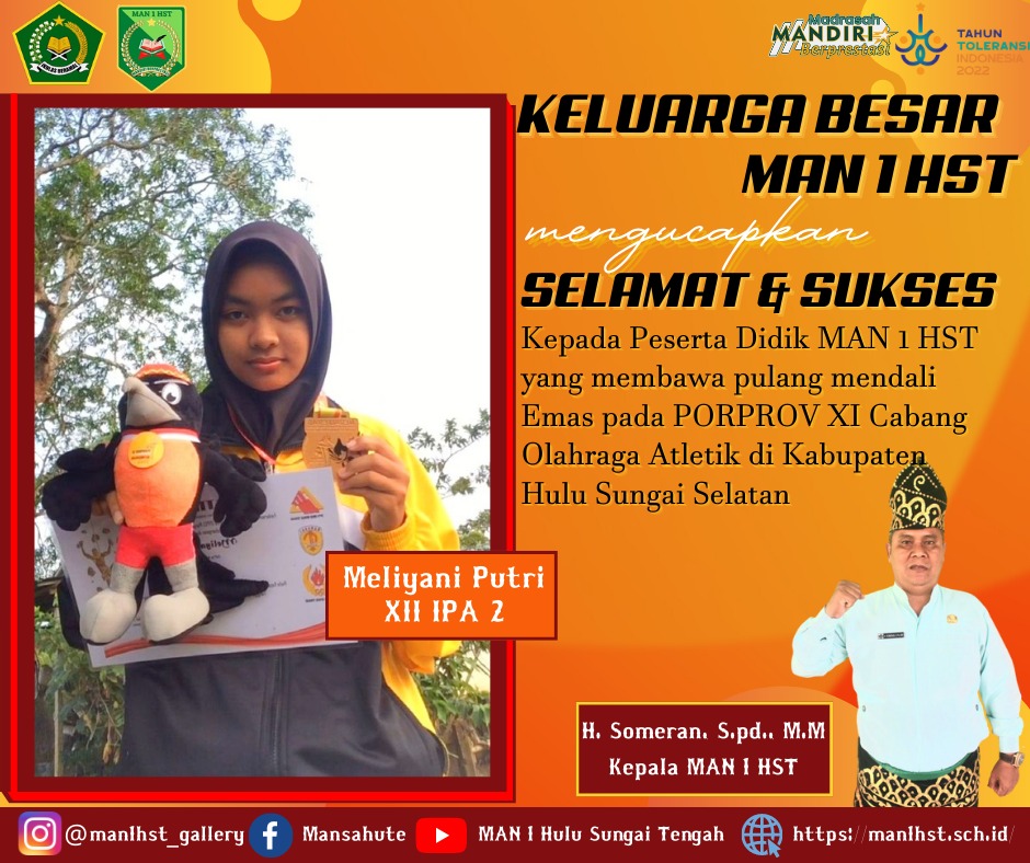 Alhamdulillah Peserta didik MAN 1 Hulu Sungai Tengah yang mengikuti PORPROV XI tahun 2022 membawa pulang mendali emas pada cabang olahraga Atletik dan mendali perunggu pada cabang olahraga Futsal.