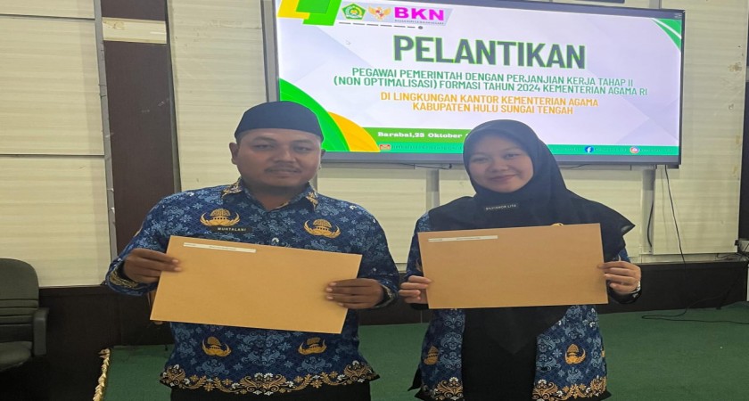 Barabai (MAN 1 HST) — Kebahagiaan terpancar dari wajah Muhtalani dan Silvianor Lita, dua Pegawai Tidak Tetap (PTT) MAN 1 Hulu Sungai Tengah (HST) yang resmi dilantik sebagai Pegawai Pemerintah dengan Perjanjian Kerja (PPPK) Tahap 2 (Non Optimalisasi) Formasi Tahun 2025 Kementerian Agama,Kamis (23/10/25).