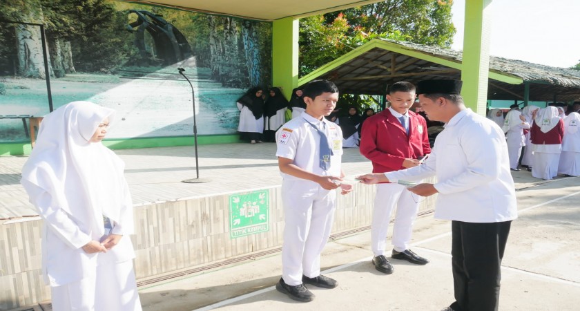 Barabai (MAN 1 HST) - Gerakan Pramuka MAN 1 Hulu Sungai Tengah (HST) menyerahkan piagam penghargaan dan voucher belanja di Kantin Madrasah kepada perwakilan kelas yang berhasil meraih juara dalam rangka lomba memperingati Hari Baden Powell. Penyerahan piagam tersebut dilaksanakan setelah upacara bendera pada Senin (20/04/2026) di lapangan madrasah.